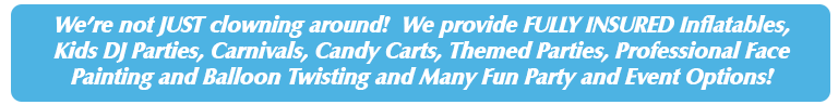 Let us help you create the party of your dreams and memories of a lifetime with one of our guaranteed to be fun parties. We offer Clown Parties, Kids and Adult DJ’s, Carnivals, Magic, Diva-Spa, Character, Princess, Sports, Inflatables, Pirate, Super Heros, fabulous face painting and super cool balloon twisting and party games and activities as well as awesome craft activities and stuff a pets, deluxe candy carts and concessions, caricatures, tents, tables and chairs and so much more.